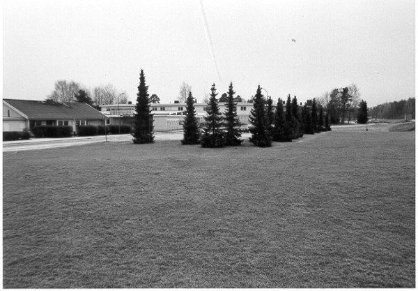 Beskrivning: I bildens mitt bakom träden syns Sundahallen. Efter ombyggnation på 1990-talet kom den att heta Sunda Cash. Numera heter affären Tempo (2008). Granarna sågades ned när parkeringen utökades.