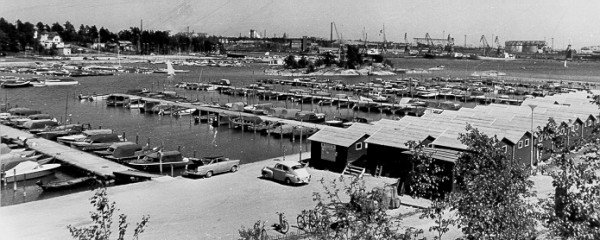 Beskrivning: Motorbåtsklubbens småbåtshamn i Badhusviken vid Femöre. Den anlades 1966. I bakgrunden syns hamnen. Källa: Text tillhörande foto