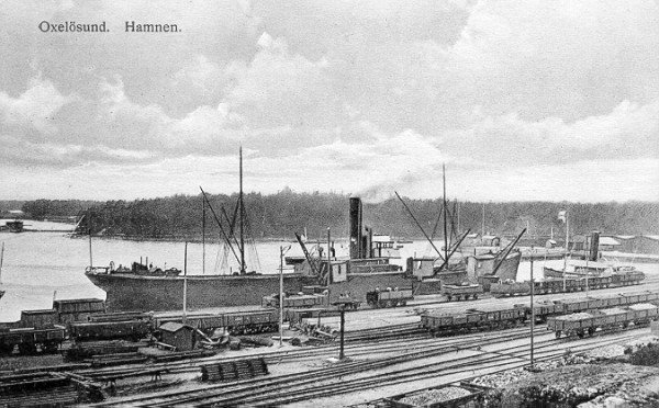Beskrivning: Kaj 3 i hamnen. Lossning av fartyg med ångkranar. Början av 1900-talet. Källa: Text tillhörande foto