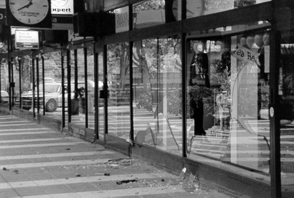 Beskrivning: Krossat skyltfönster orsakat av bankboxsprängning i den närliggande Sörmlandsbanken på Järntorget.