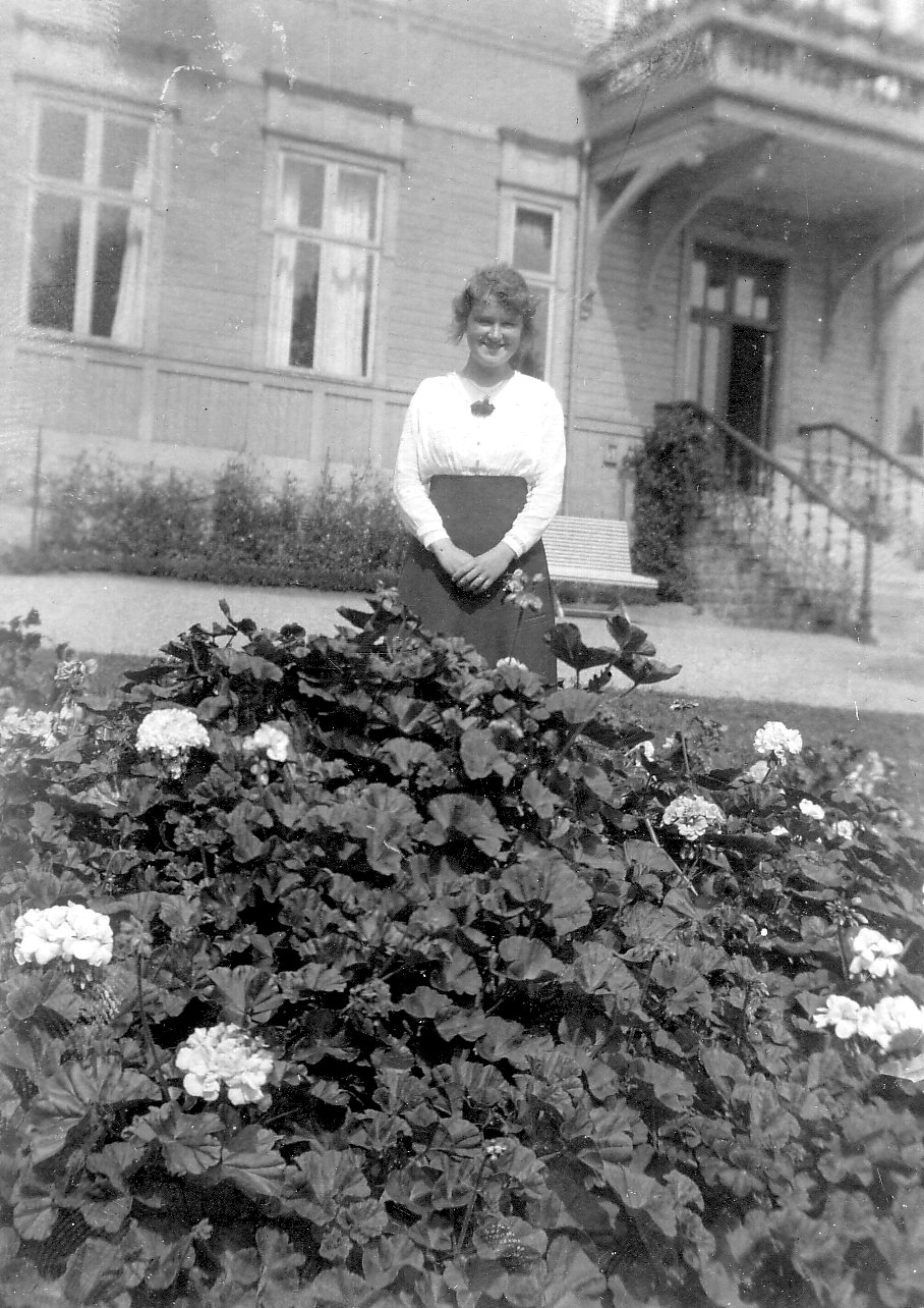 Beskrivning: Utanför Thams villa den 2 augusti 1920. Kvinnan på bilden heter Mimi Genstorff och arbetade hos Percy Tham. Källa: Text enligt foto