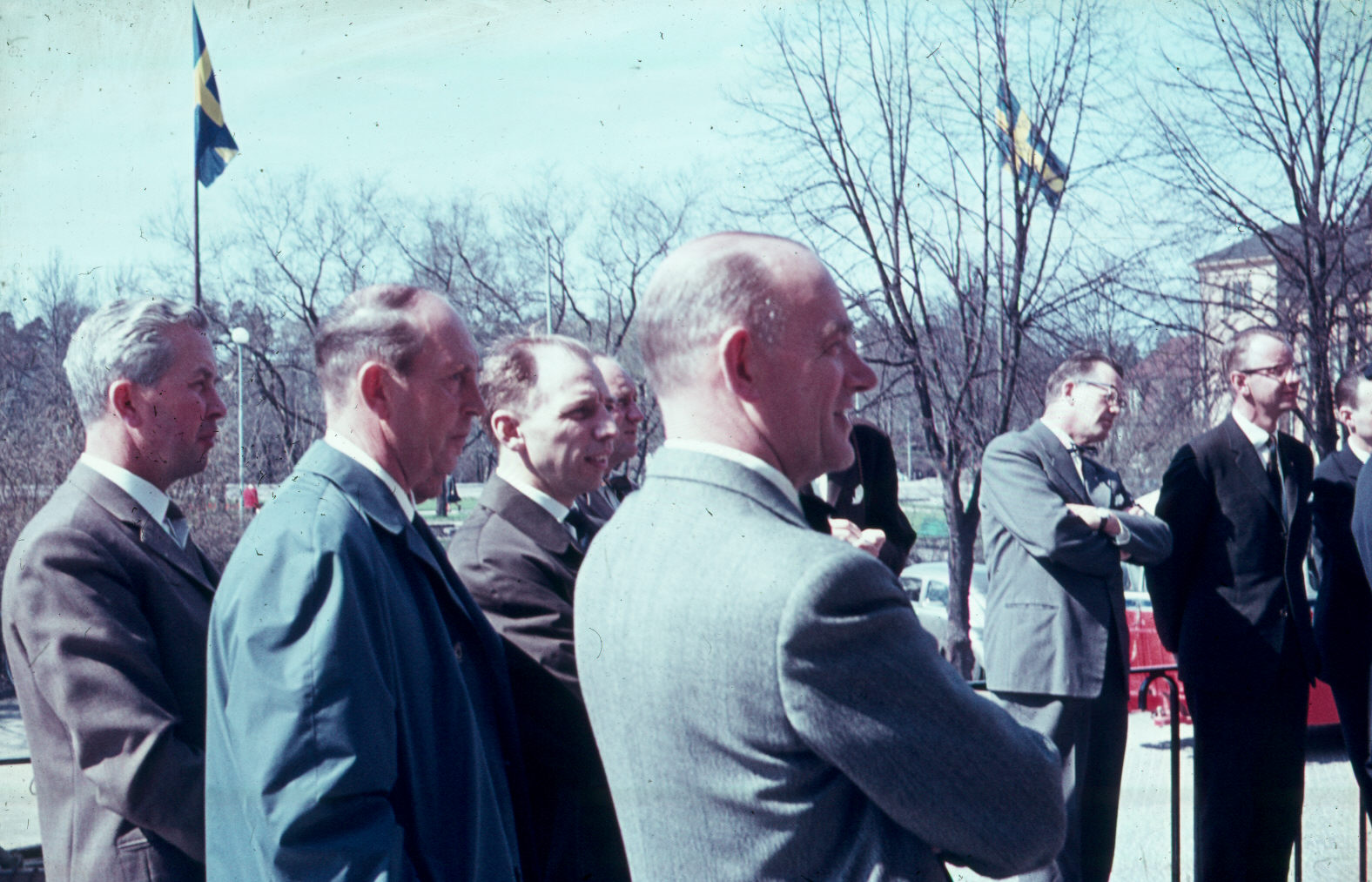 Beskrivning: Vid trappan utanför Folkets Hus. Gäster från invigningen av Hamnbron.
