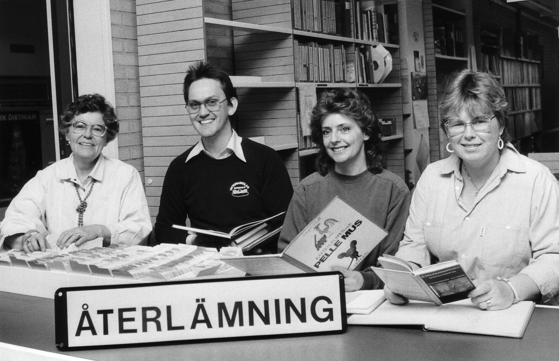 Beskrivning: Personal på biblioteket. Från vänster Karin Främling, Conny Zetterlund, Inga-Lill Ljungberg och Agneta Jonsson. Källa: Håkan Linderyd Biblioteket