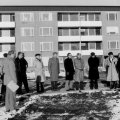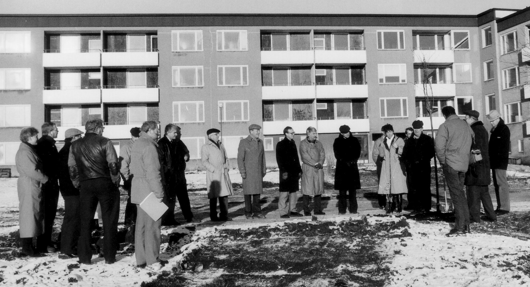 Beskrivning: Landshövding Bengt Gustavsson och kommunalrådet Standi Rönnberg ska gräva en grop för den lind som länsbostadsdirektör Ingvar Gyllenhammar håller i . Och därmed startar nu formellt den stora ombyggnaden av malpåsehuset i Frösäng. På bilden ser vi även Sven Svensson och