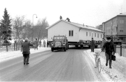 Beskrivning: Transport av en av föreningsvillorna från Malmbyn över järnvägsbron. Den 8 meter långa femrumsvillan flyttas från Malmbyn till ett villaområde vid Sunda. Polisen fick spärra av ett kvarter i taget och dirigera trafiken åt sidogatorna. Planen var att köra över nya vägbron men man vågade inte, för man fruktade att betongkonstruktionen inte "brunnit" färdigt och ville inte ta några risker. Transporten gick därför via Föreningsgatan och över gamla vägbron ut på Hamngatan via Bergvägen. Den sträckan klarades på ca tre och en halv timme till Sunda.
