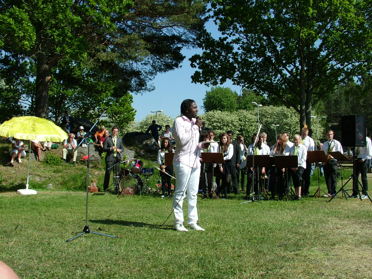 Beskrivning: Årets nationaldagstalare på Jogersö var tennistränaren och Oxelösundsprofilen Caxton Njuki. I bakgrunden ser man bland annat Oxelösunds musikskola som tillsammans med Oxelökören och Oxelö gille stod för underhållningen.